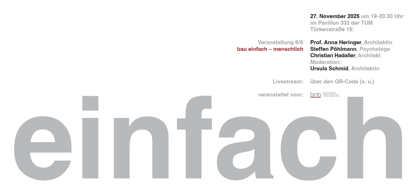 Mit der Aufforderung bau einfach und der zugehörigen Veranstaltungsreihe an der HM (Hochschule München), Raum 023 Audimax, Karlstraße 6, und der TUM (Technischen Universität München), Pavillon 333, Türkenstraße 15 möchte der bab mit Vorträgen, Diskussionen und natürlichem Ingenieurverstand ausloten, welche Ansätze, Projekte, Ideen es gibt, wie wir sie voranbringen und dieser Herausforderung gerecht werden können.